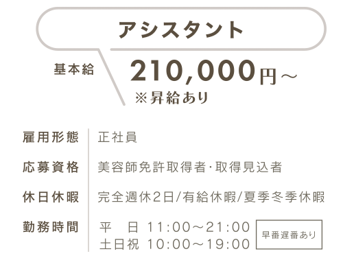 - ご安心ください。当店は完全週休2日制で、夏季休暇・冬季休暇・有給・バースデー休暇など、お休みがとても充実しています。しっかり休んで、しっかり働く。そんなメリハリのある働き方ができるサロンです。