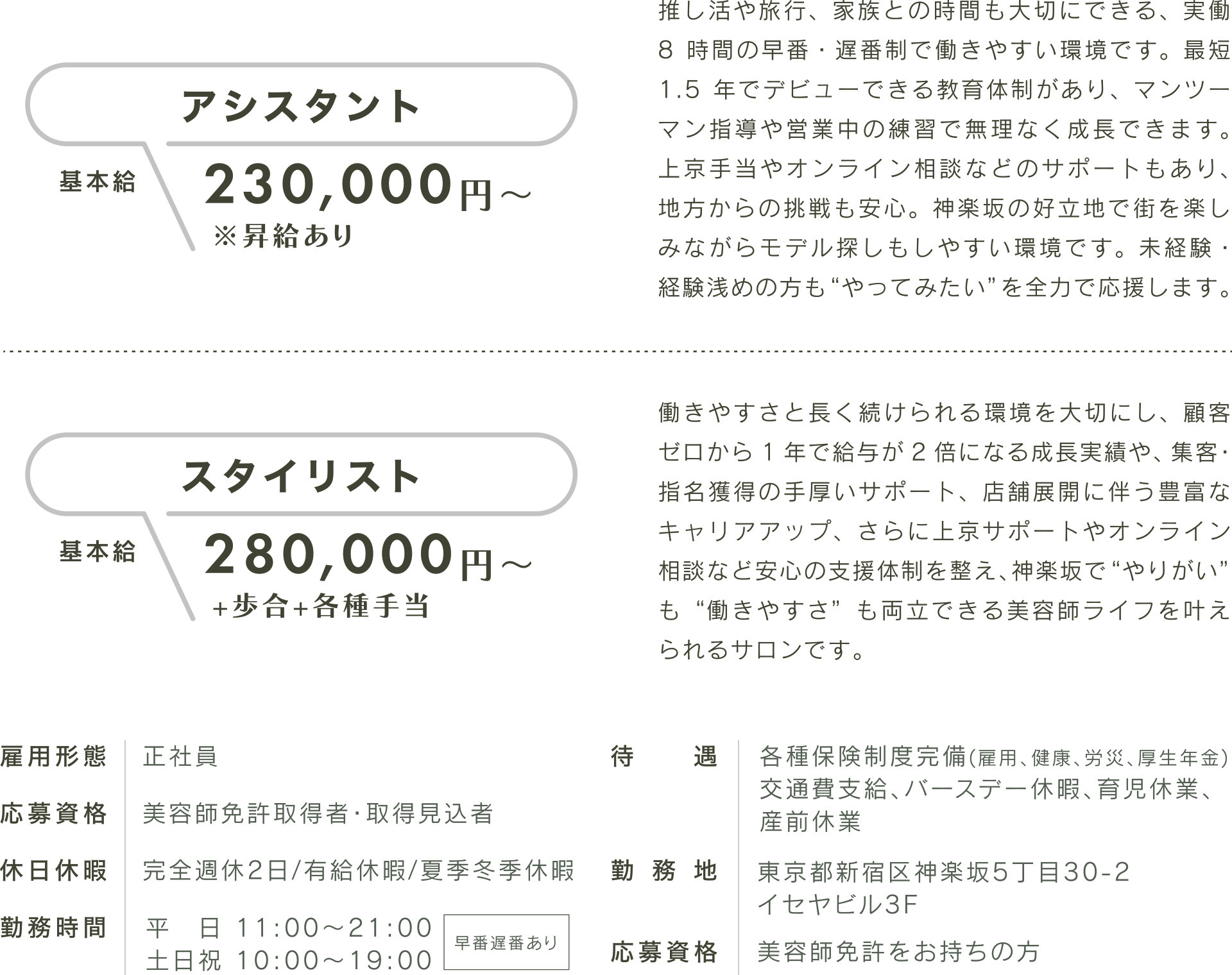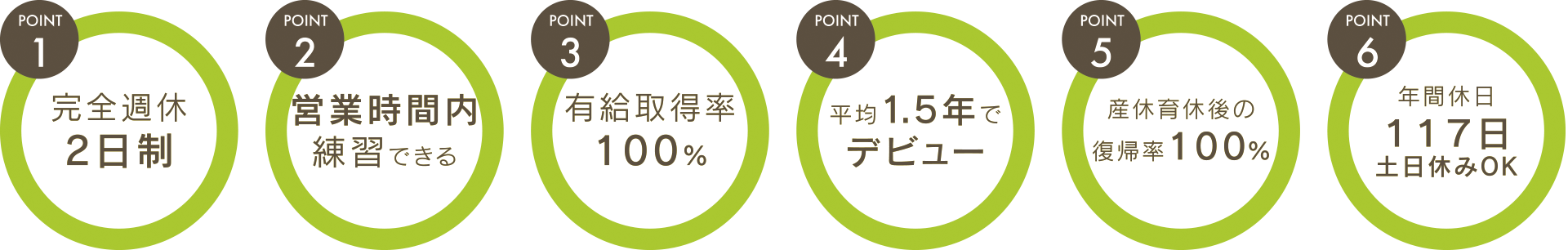 - ご安心ください。当店は完全週休2日制で、夏季休暇・冬季休暇・有給・バースデー休暇など、お休みがとても充実しています。しっかり休んで、しっかり働く。そんなメリハリのある働き方ができるサロンです。
